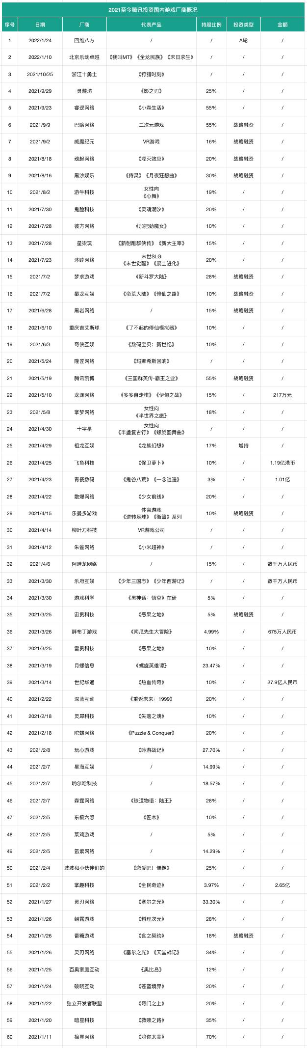 就国内市场而言,2021至今,腾讯已对60家游戏公司发起投资,其中以二次元手游为主,辅以部分针对单机游戏的投资。