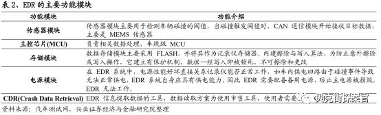 EDR别名包括行驶记录仪(非行车记录仪)、数据存储器,其功能主要是记录车辆碰撞前、碰撞时、碰撞后三个阶段中,汽车的速度、ABS状态、安全带状态等关键运行数据。
