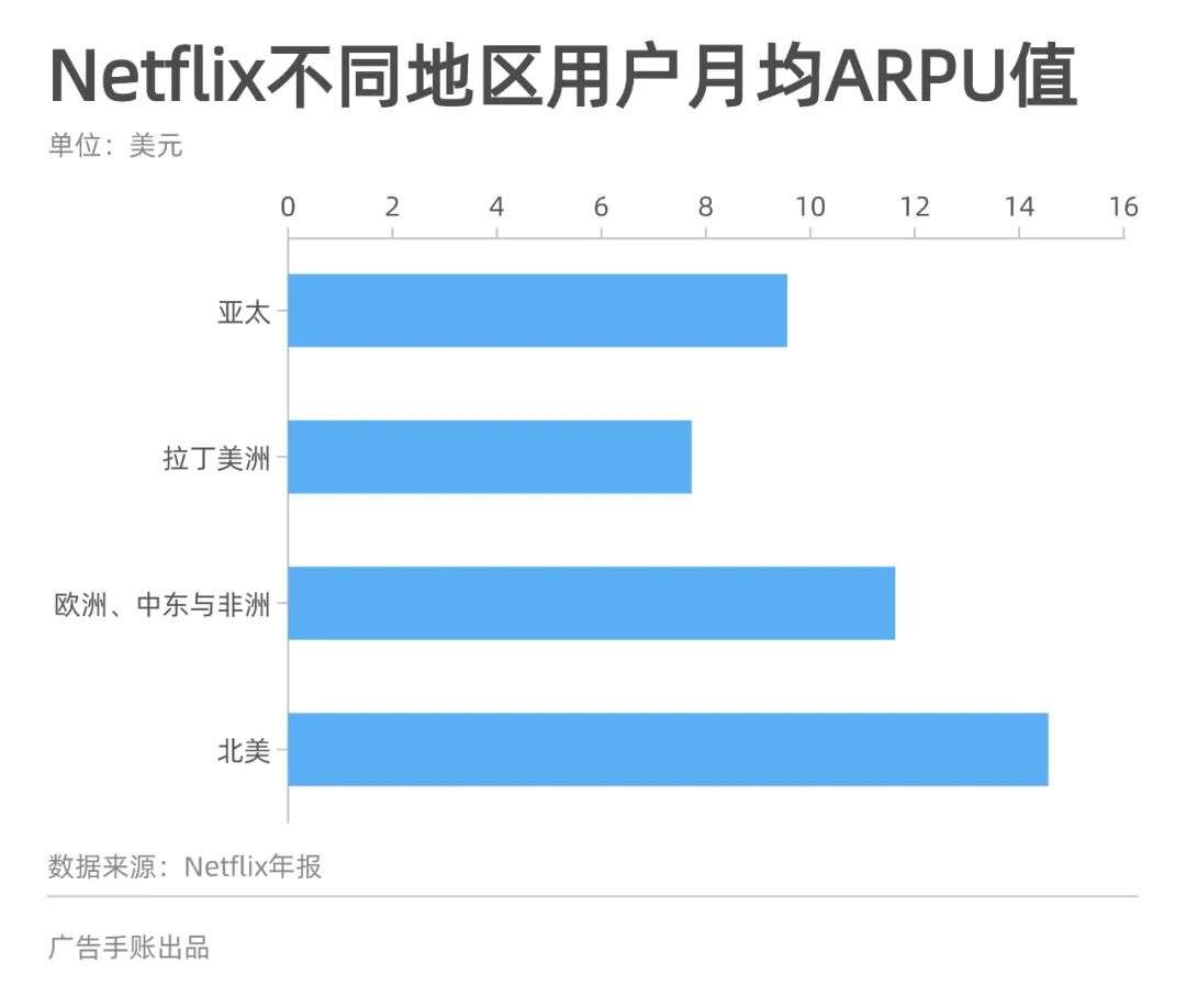 值得注意的是囿于可支配收入水平的不同,三大市场在付费意愿上存在比较明显的差距:以2021年为例,北美用户以每月14.56美元遥遥领先,而欧洲等市场和亚太地区则仅有11.63美元和9.56美元。这意味着Netflix在北美以外寻找增量,必然需要直面用户价值衰减的问题。