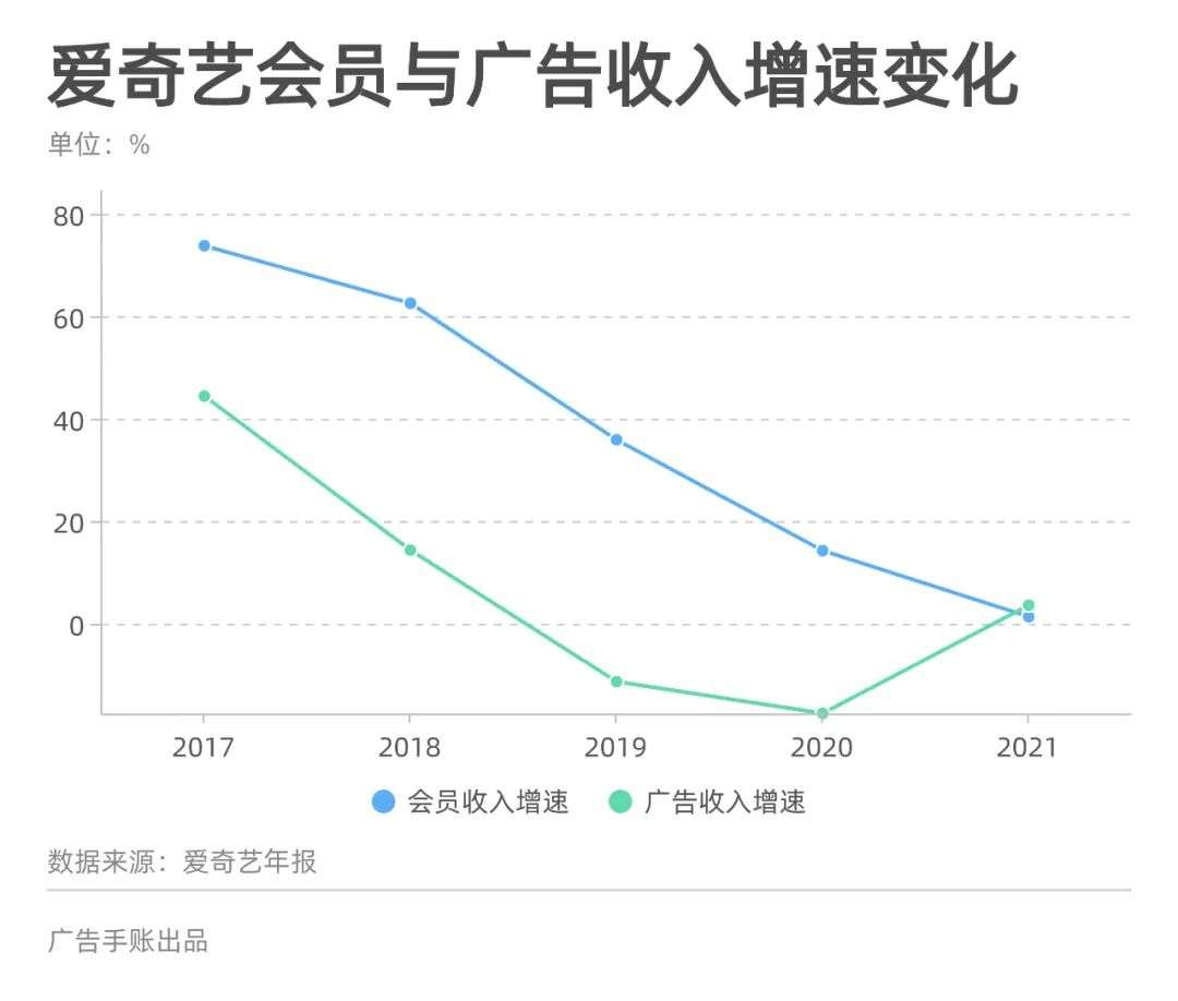 即便定价不低,爱奇艺的会员收入也呈现出后继乏力的迹象。在2021年,爱奇艺披露的会员收入为167.13亿元,同比增幅仅有1.35%;如果在更长的时间轴上观察,它的会员收入增长从2017年开始就已经逐年下滑。