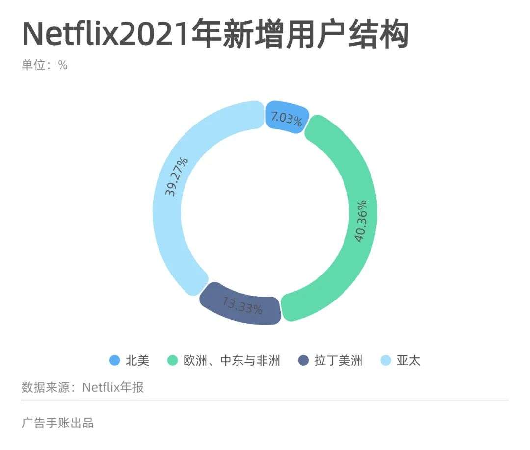而在去年1818万的新增用户中,作为大本营的北美市场占比仅有7%,显示出Netflix在该地区的拓展已趋近饱和。与此同时,新增用户中的40%来自于欧洲、中东和非洲市场,39%来自于亚太市场。