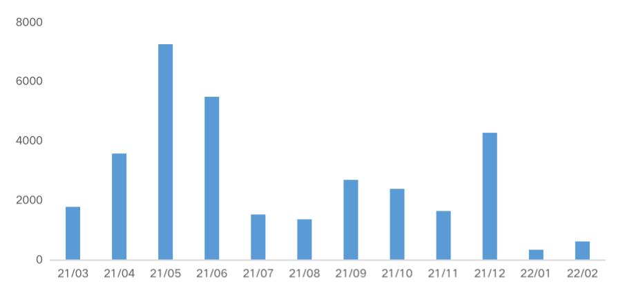2022年1-2月,国资房企仍为境内外发债主力,民营房企发债融资占比略有上升,由Q4的15%升至28%,接近去年Q3水平。为应对即将到期的海外债,禹洲集团发行1年期7.81%票息4.53亿美元新票据以交换本金总额为4.77亿美元的交换票据,为民企1-2月债券融资单笔规模最高。