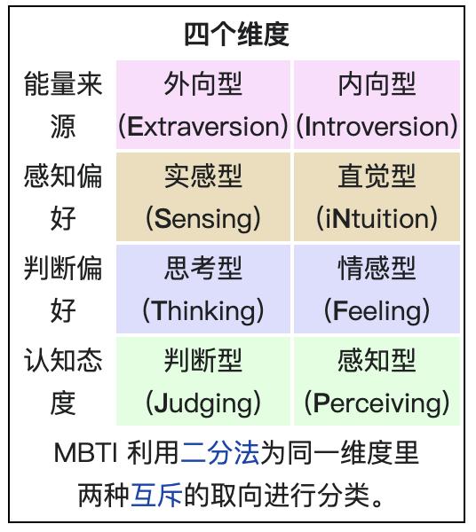 它通过让你回答一系列题目,在 注意力方向、认识方式、判断方式和生活方式四个维度 ,对你的人格特征用二分法划分。