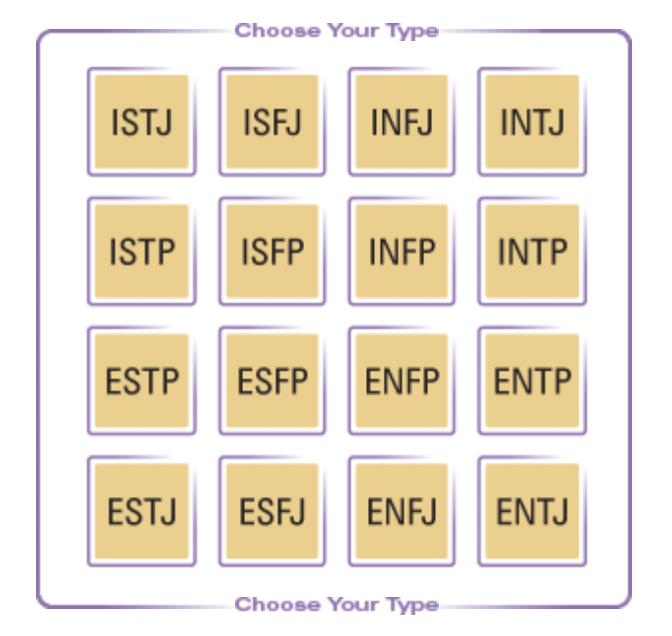 每个维度上选取一个类型,排列组合,总共可以形成 16种人格类型(即16型人格) ,每一种用四个字母标识,如INTP,ISTJ,ESFP。