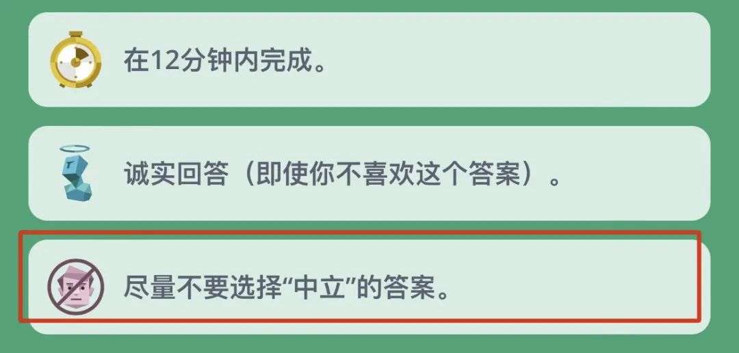 其次,MBTI测试的96道题目都是选择题。 不少人会在选项之间摇摆不定,最终不得不选一个, 导致了结果的不稳定性。