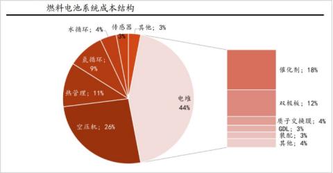 电堆及其零件和材料是整个燃料电池汽车产业的核心,成本占比达到44%,而该领域的技术门槛非常高,加拿大巴拉德(Ballard)和水吉能(Hydrogenics)掌握了最领先的电堆技术。此外,催化剂、质子交换膜、膜电极等电堆核心零部件也并没有完全实现国产化,而且生产效率较低,形成稳定的供应体系尚需时间,成本在短期内很难降下来。