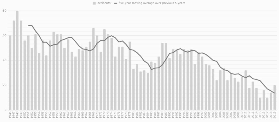 事实上,利用技术来让飞行更安全,是整个民航业一直在努力的方向。以安全为目标的探索从未停止。统计数据也能反映出航空业的进步。近70年来,民航领域重大事故发生率一直呈现出减少的倾向。过去七十年间,民航业在安全性上不仅显著优于汽车、自行车和步行,与自己相比也有着显著进步。
