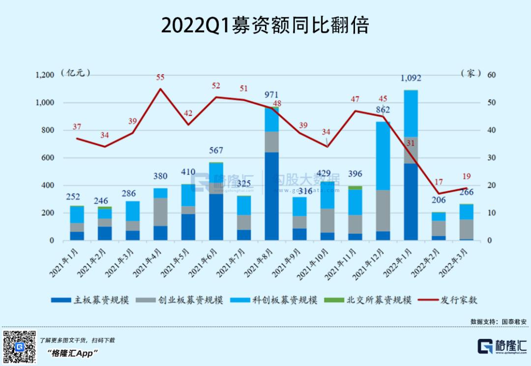 从募资金额来看,截至3月18日,2022Q1募资总额达到1564.36亿元,同比翻倍,主要是由于中国移动在美国退市后成功登陆A股,其IPO募资额达到519.81亿元,占2022Q1IPO募资额近35%。除此之外,在承销新规修订后,双创板块发行估值维持高位,2022Q1创业板新股平均募资金额上行至16.45亿元,科创板则维持在23.10亿元水平。