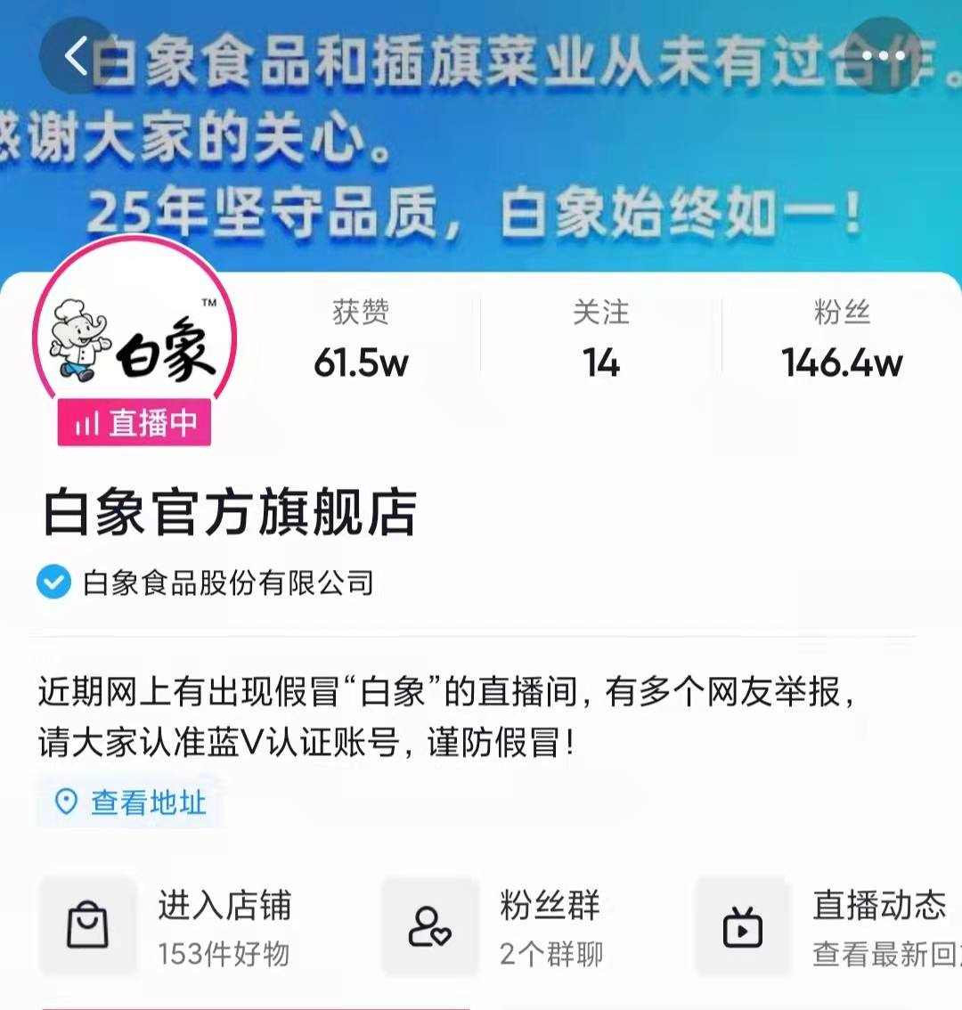 1个小时后,白象通过官方微博第二次硬气回应:“白象食品和插旗菜业从未有过合作,感谢大家的关心。25年坚守品质,白象始终如一。”