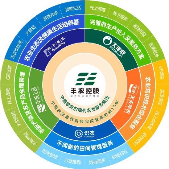 加之期间成立的甲子启航。丰农控股正式形成了“种、学、管、卖、投”的现代农业服务矩阵,开始了体系化、科学化的现代农业服务之路。