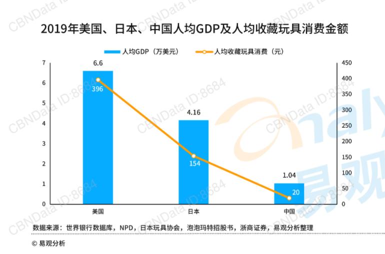 从大的时代背景来看,收藏玩具消费的崛起与人均GDP也成显著的正相相关关系,从数据来看,在2019年,中国的GDP达人均1.04万美元,人均收藏玩具消费20元,相比于美国(人均GDP:6.6万美元,人均收藏玩具消费396元)、日本(人均GDP:4.16万美元,人均收藏玩具消费396元)的人均收藏玩具消费尚有较大差距,但随着近几年人均GDP的快速上升,国内人均收藏玩具的金额也显著提升。