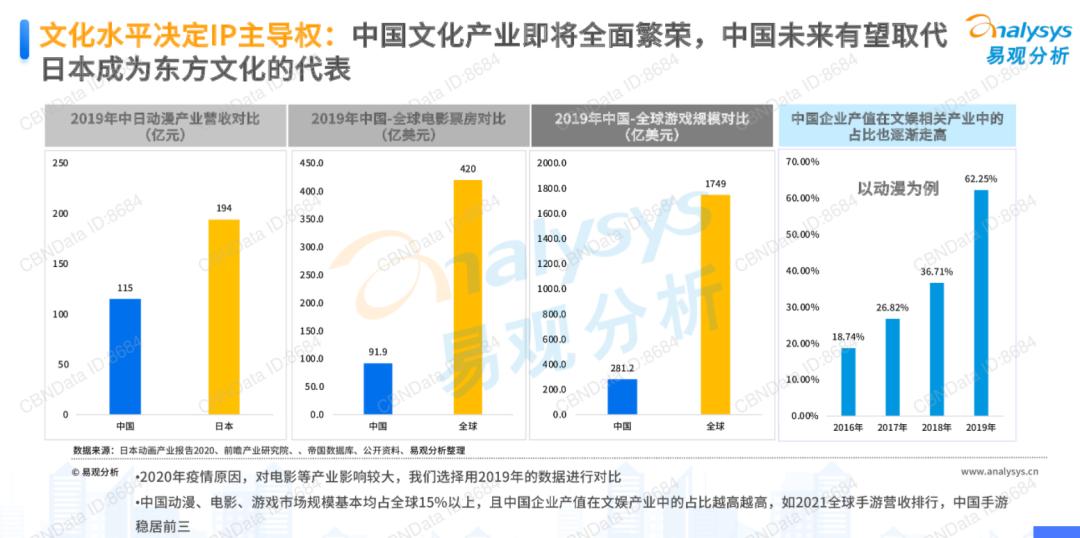 而到2020年因新冠疫情,国际电影行业受阻,但国内动漫、电影、游戏市场迅速崛起,规模基本占全球15%以上,并且中国企业的产业值在文娱产业中的占比越来越高,比如2021全球手游营收排行,中国手游稳居前三。