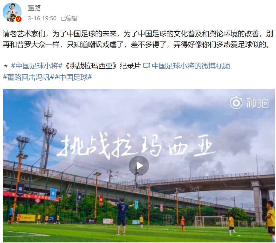 其实不止足球,自古以来都是做事的遭骂名,看热闹的道德夫子坐而论道,大将军前线浴血,朝堂上御史言官吹毛求疵,假如真有董路中饱私囊的证据,不妨实名举报,诉诸法律,但仅仅因为骂了自己就想动用国家工具党同伐异,未免有失春晚演员身份气度。