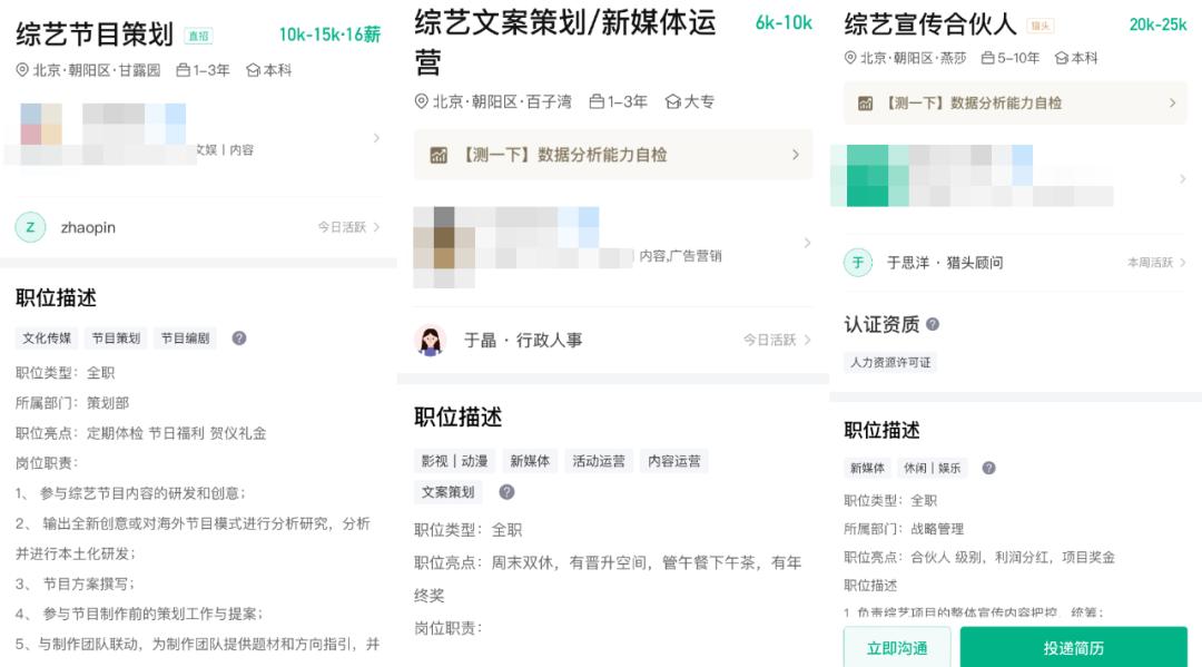 沐沐在播客里也分享了她对这一内容营销新趋势的观察。疲于在综艺市场奔波却找不到活儿的她发现,点开各大招聘APP,如今各行各业的企业都在不约而同地从综艺界“挖人”,想要招聘能负责企业文娱内容开发的制作人才。
