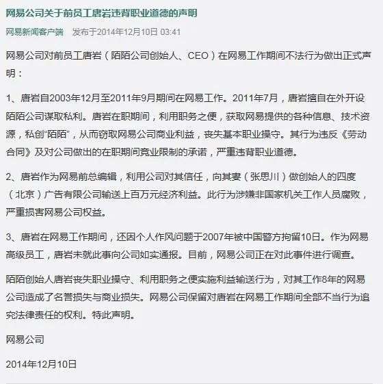 就在陌陌上市前一天,“老东家”网易突发声明,列出唐岩的“三宗罪”, 称其在网易存在不法行为,丧失操守谋取私利,为妻子所在公司输送利益,且因作风问题被拘留10日。不过,唐岩也立马表明了态度,在那张流传出的照片中,唐岩倔强的中指,竖得笔直。