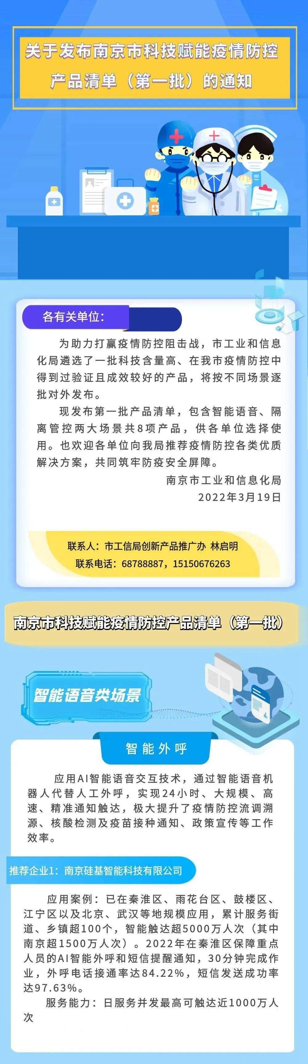 3月19日,南京市工信局发布了“关于发布南京市科技赋能疫情防控产品清单(第一批)的通知”,其中“硅基智能抗疫产品”,成为南京首选推荐产品。