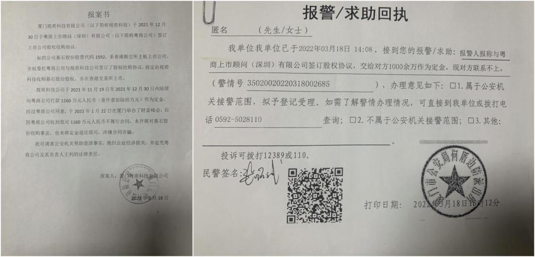 3、在对目标上市公司要约收购的实际执行中,粤商顾问及其法人王利未执行双方协议之约定,其行为已涉嫌欺诈,视奕科技已向警方报案并委请律师同步展开民事及刑事维权。