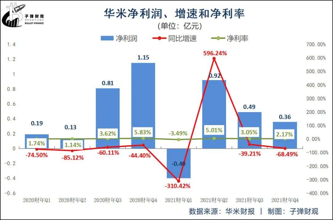 据华米此前披露的财报显示,最近8个财季,除了2021财年Q2,其他财季的华米净利润增速均为负值。其中,最低净利润增速出现在2021财年Q1,为-310.42%。