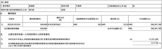 在阿里回购250亿美金创下中概股回购纪录之后,腾讯与小米跟上,3月25日晚间,腾讯发布公告称,公司3月25日以每股352.8港元至365港元的价格回购83.8万股,耗资约3亿港元。