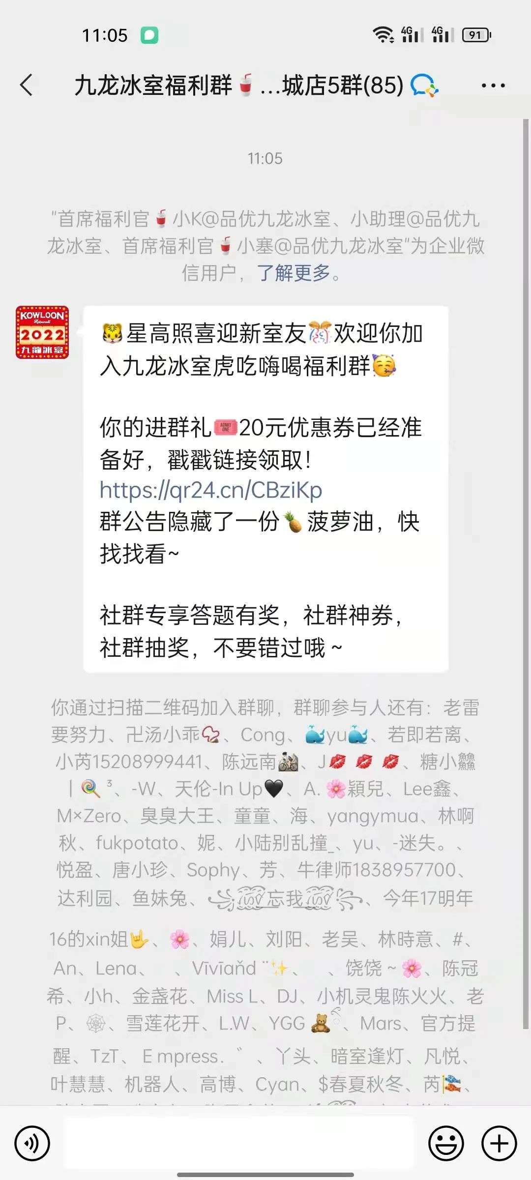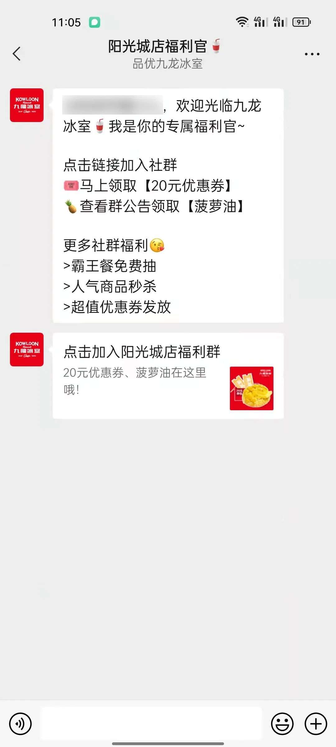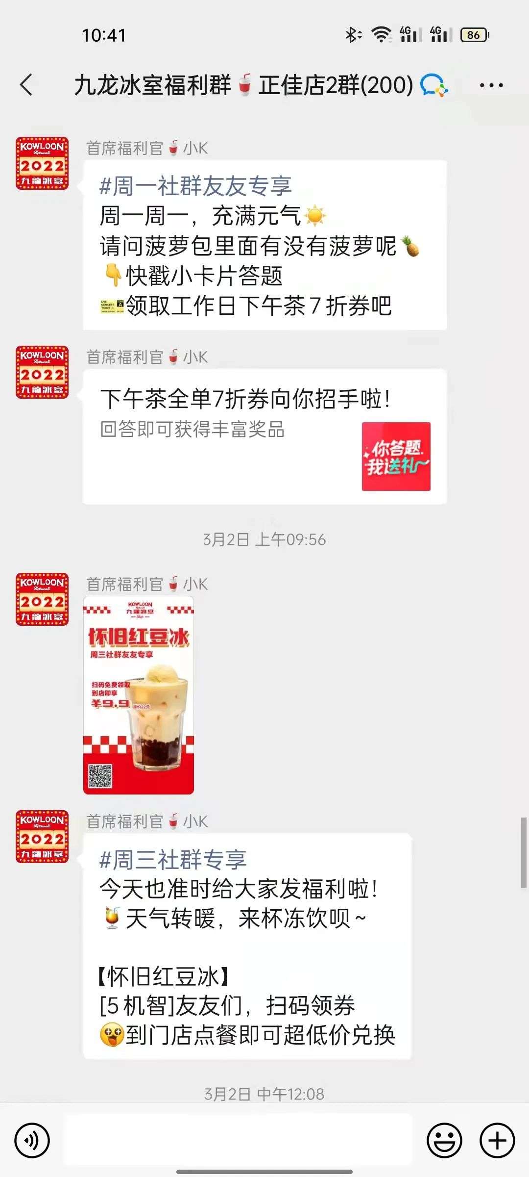 在九龙冰室的社群中,每周三根据门店的数据情况,选择一款单品给私域中的顾客发福利。顾客扫码就可以直接领取优惠券并到店使用。