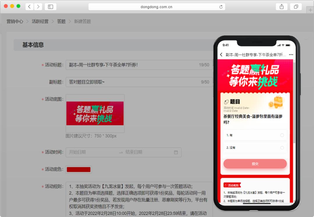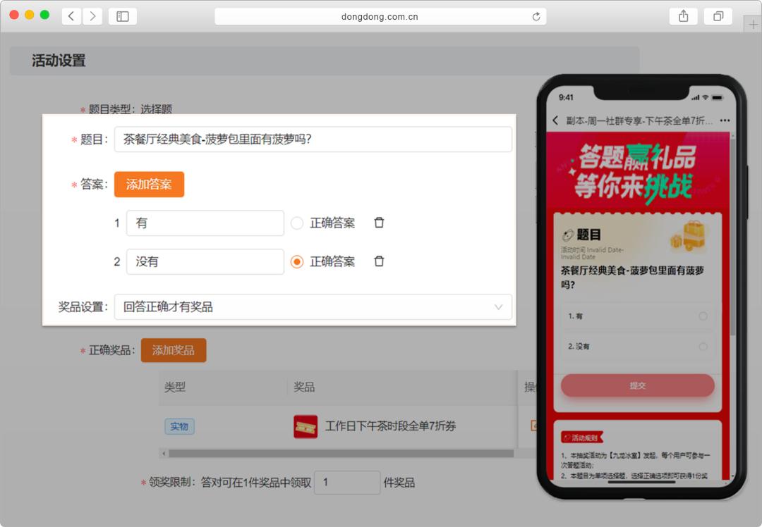 根据不同的活动需求,门店可以设置优惠券的领取方式,顾客回答正确题目就可以领取门店的优惠券。(也可以设置回答“错误和正确”都有奖品领取)