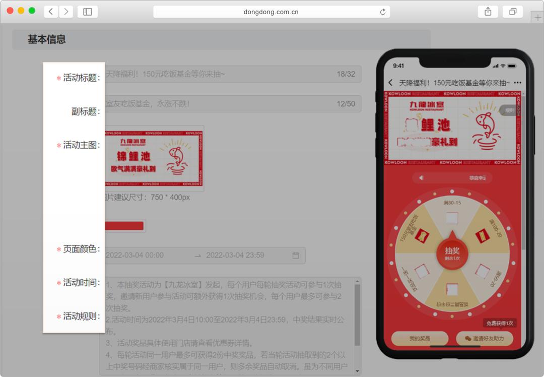 在咚咚来客系统设置好幸运大转盘的活动内容、活动规则: 每个顾客都有2次抽奖机会,只要点击链接就可以参与抽奖。