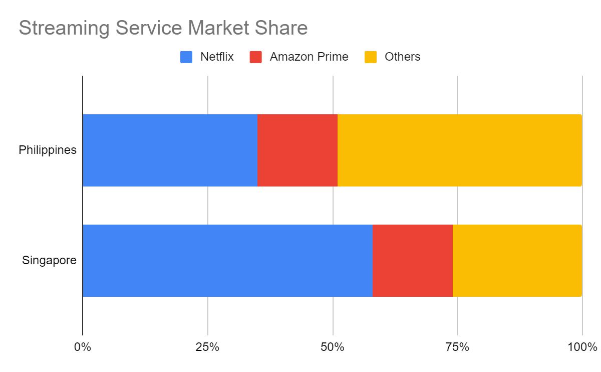 同样,该地区的其他国家也由 Netflix 主导。例如,新加坡仍然依附于 Netflix,占有57.5%的市场份额。