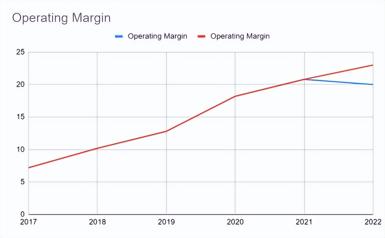 这可能是合乎逻辑的,因为收购增长尚未反弹到大流行前的水平。此外,其他地区的宏观经济变化可能会影响许多人的购买力。鉴于此,年营业利润率可能会低于19-20%。但是,线性趋势分析预测它为 22-23%。