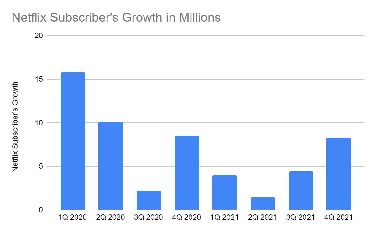 在 2020-2021 年第四季度,核心业务的订阅用户同比增长从22% 下降至 9%。这主要是由于 HBO Max、Disney+ 和 Apple TV+ ( AAPL ) 的介入。