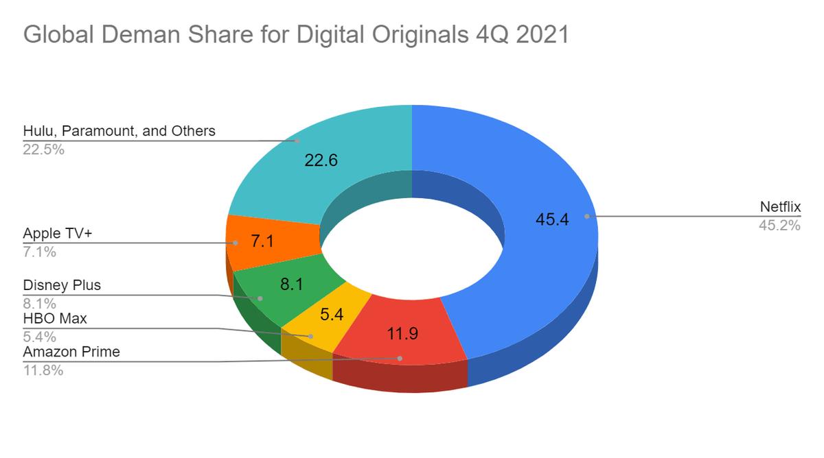 虽然四季度增速有所加快,但增速不足以弥补三季度用户流失。Netflix 继续主导全球市场,但其需求份额在一年内缩水至45% 。下降在美国最为明显。