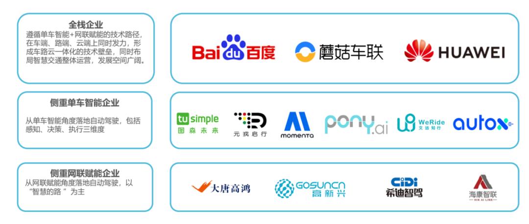 另一类:像百度、蘑菇车联、华为等坚持单车智能+车路协同的全栈型企业,强调关注车本身的同时,在车路云三端建立技术壁垒,布局智慧交通整体运营。