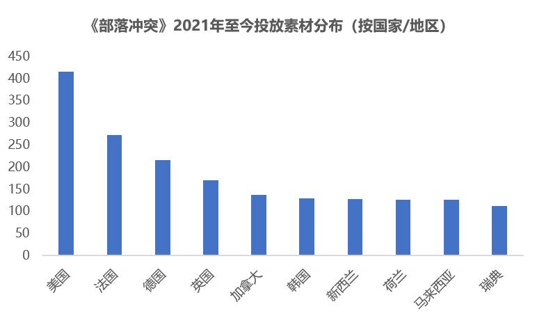 从市场分布来看,Supercell三款游戏第一大投放市场均为美国,单一市场素材占比均超过10%,而美国也是上述三款游戏第一大市场。