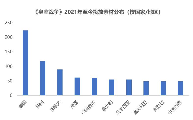 《荒野乱斗》和《部落冲突》主投美洲市场和欧洲市场,TOP3投放市场依次为美国、法国和德国。除了欧美市场,《皇室战争》对亚洲市场(中国台湾、中国香港、马来西亚、新加坡等)的投放力度明显大于前两款产品。