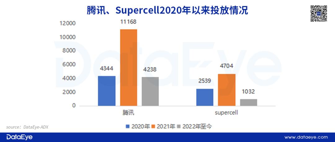 总的来说,21年腾讯、Supercell明显加大了投放力度,两家公司在海外市场分别投放 11168 和4704 组素材,同比上涨157%和 85%。