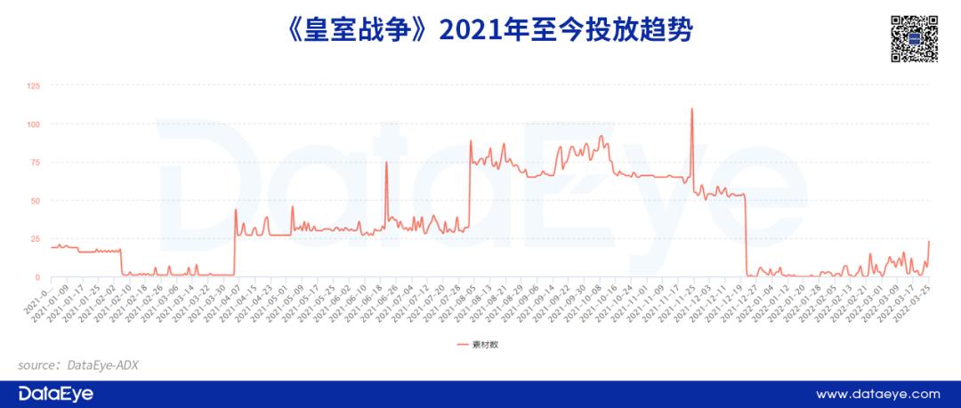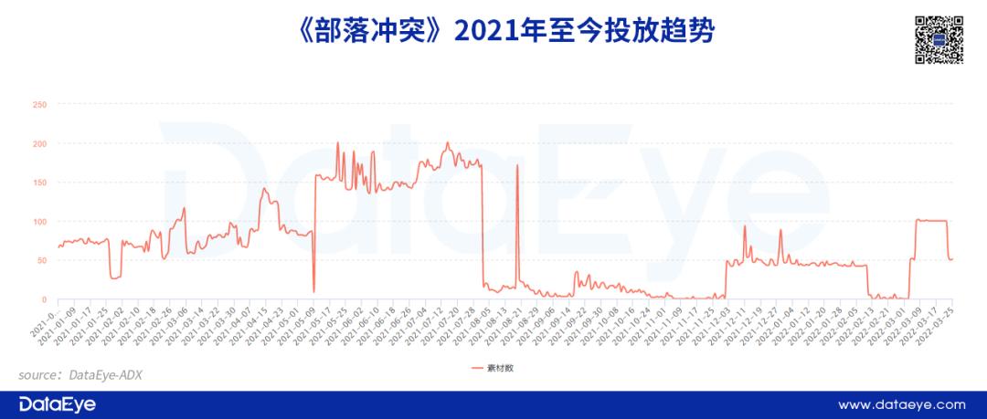 Supercell三款重点游戏也实行持续投放的策略。总的来说,三款游戏的日均投放素材量并不算高,即便是投放总量最高的《荒野乱斗》,日均投放素材量不过100-200组,《皇室战争》大部分时间日均投放素材量在75组以下。
