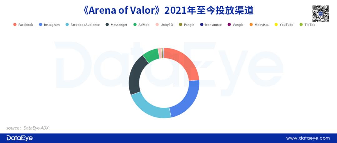 具体来看,《PUBG MOBILE》第一大投放渠道是谷歌旗下的AdMob,单一渠道占比超1/3,但整个Facebook系占比超1/2;《Arena of Valor》第一大投放渠道是Facebook,Facebook系包揽了近90%的投放资源。