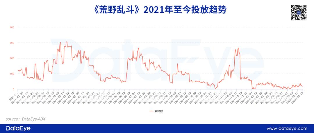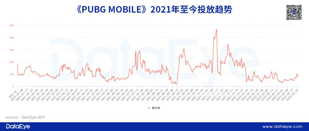 腾讯旗下两张“王牌”均实行持续投放策略,《PUBG MOBILE》投放量相对平稳。两款游戏下半年投放力度均明显加大,《Arenaof Valor》表现更为明显,并将这一趋势延续到了2022年,而《PUBG MOBILE》22年以来单日投放素材量大幅降至100组以下。