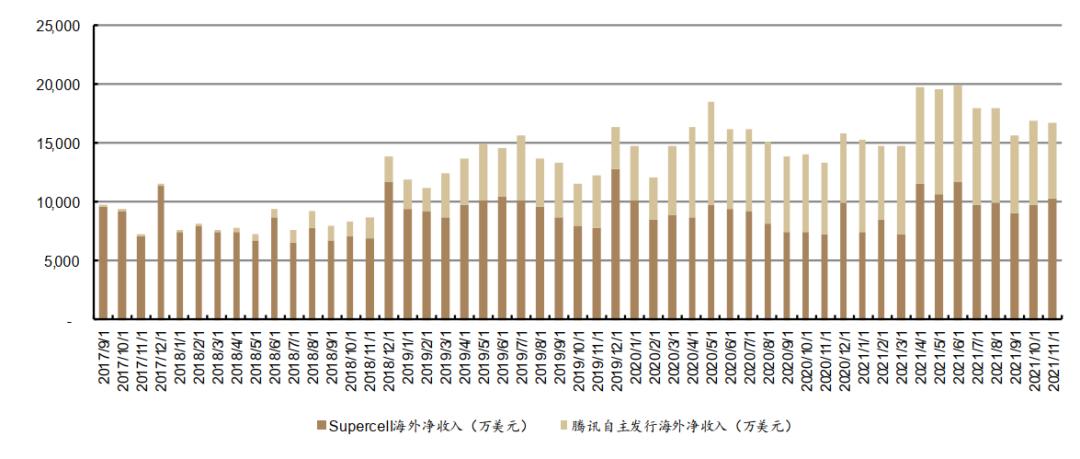 根据Sensor Tower,2021年1-11月,Supercell海外净收入与腾讯海外自主发行净收入占比约为55:45,也就是说Supercell贡献了腾讯海外市场过半的流水。