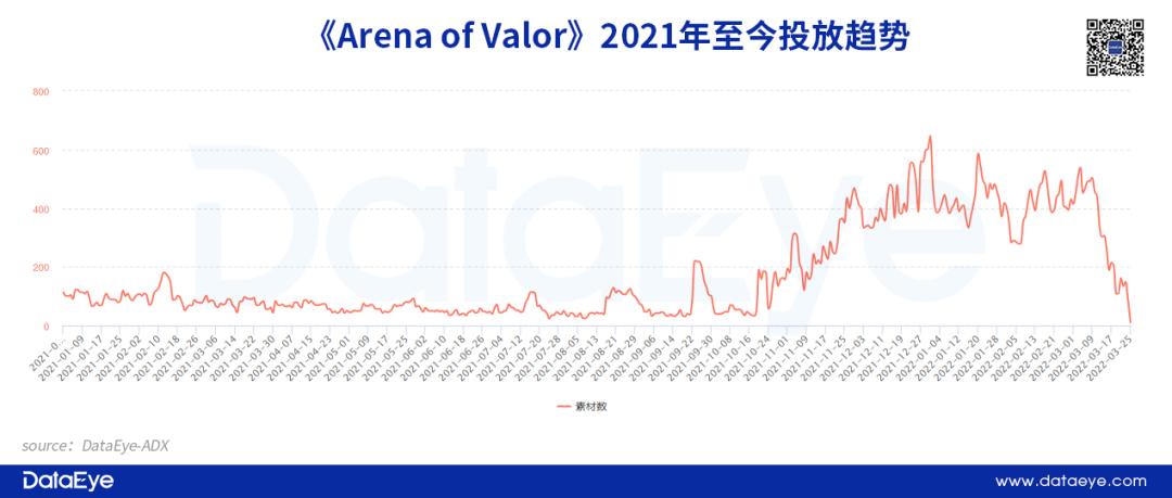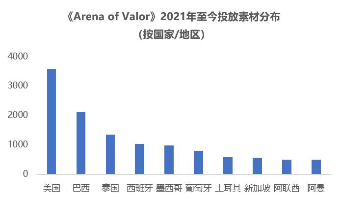 还有一个重要趋势是21年下半年腾讯对《王者荣耀》海外版《Arena of Valor》的投放力度明显加大,这一现象在22年尤为明显。