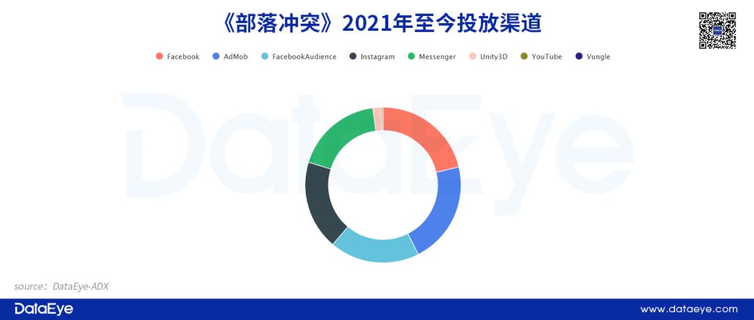Supercell三款游戏投放渠道同样以Facebook系为主,Facebook系包揽了6成以上的投放资源。