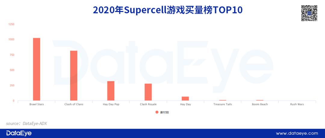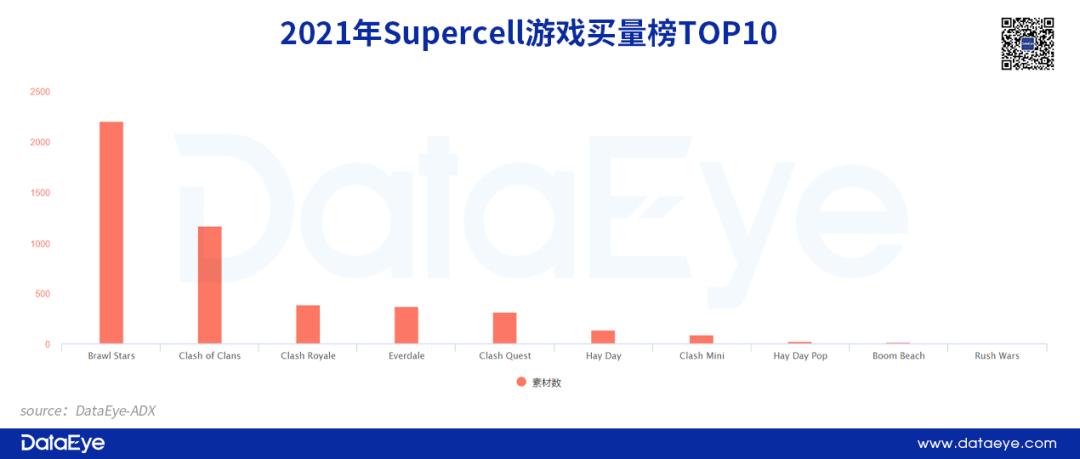 Supercell投放同样集中于头部产品,买量榜TOP3占据80%的素材总量。
