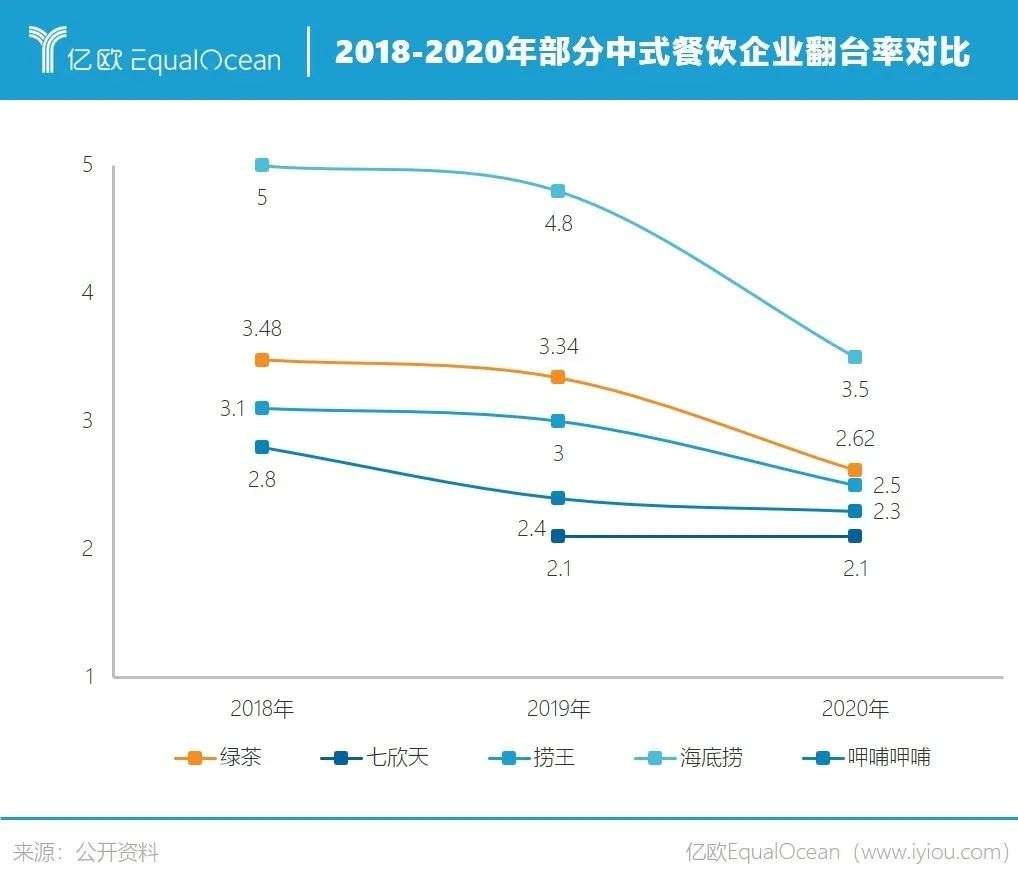 实际上,随着年轻消费者对餐饮品牌的忠诚度下降,用户粘性愈难培养,翻台率持续低迷是餐饮企业面临的共同难题。呷哺呷哺、七欣天和捞王近两年的翻台率均未超过3,海底捞2021年上半年的翻台率也只有3.3。