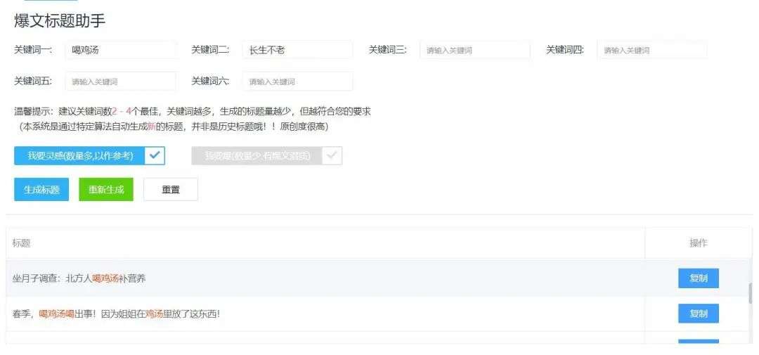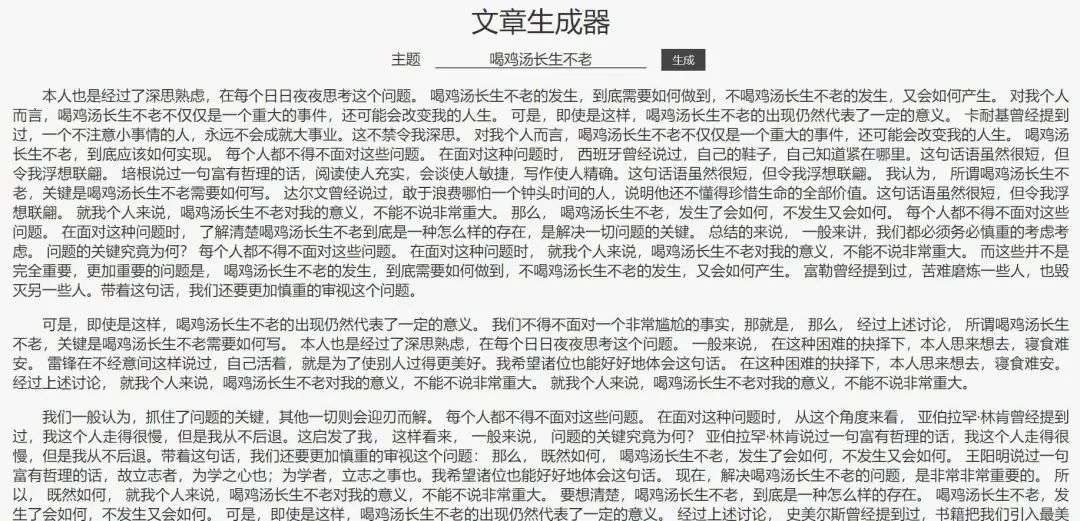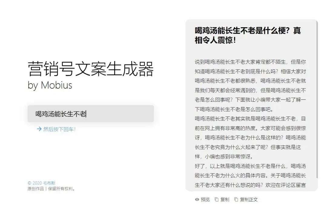 第一款名叫《营销号文案生成器》的工具,从输入到产出,只需使用者给出一个标题,比如:喝鸡汤能长生不老。