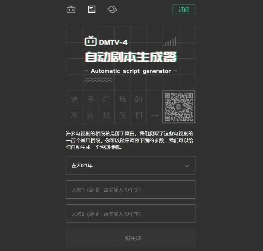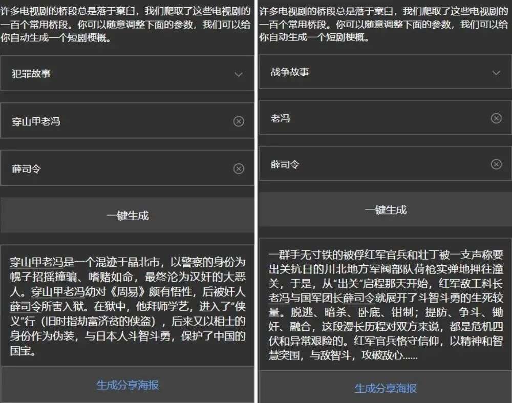 爬取了海量国产电视剧数据的《剧本生成器》小程序可以帮你生成一段短剧梗概。提供故事题材和两个主要任务的名字后,一段「引人入胜」的剧情介绍倚马可待。