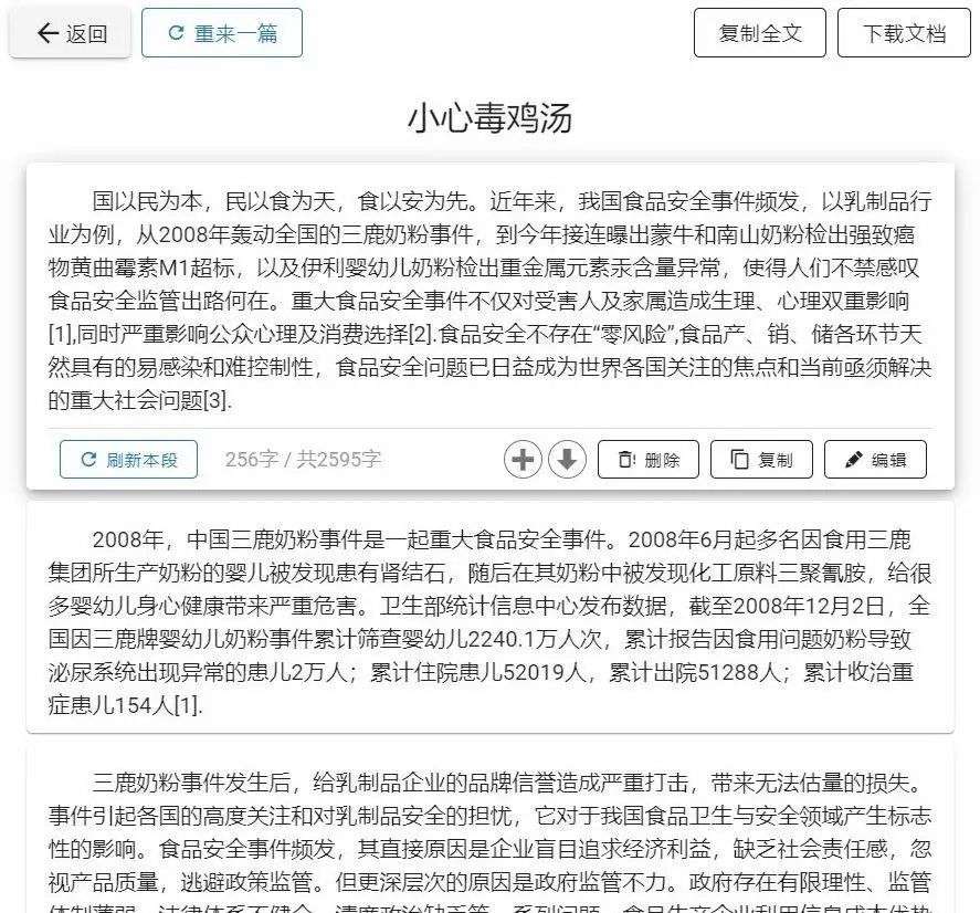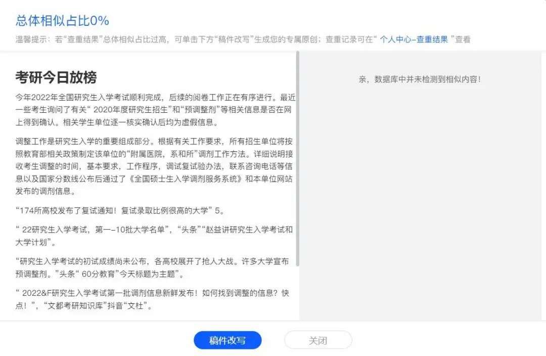 利用网页自带的查重功能还可以与数据库中的其他文本进行比对,得出相似度。刚才生成的这篇文章网页显示相似度为 0。