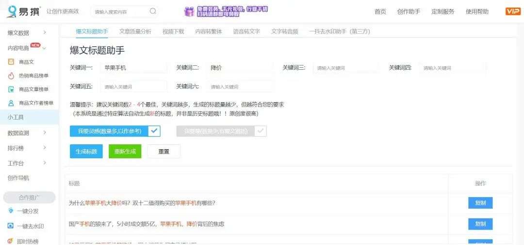 「爆文标题助手」这样简单粗暴的名字不免让人内心涌现出不妙的感觉,输入「苹果手机」「降价」两个关键词后果然生出了不少引诱力极强的标题: