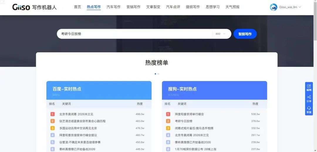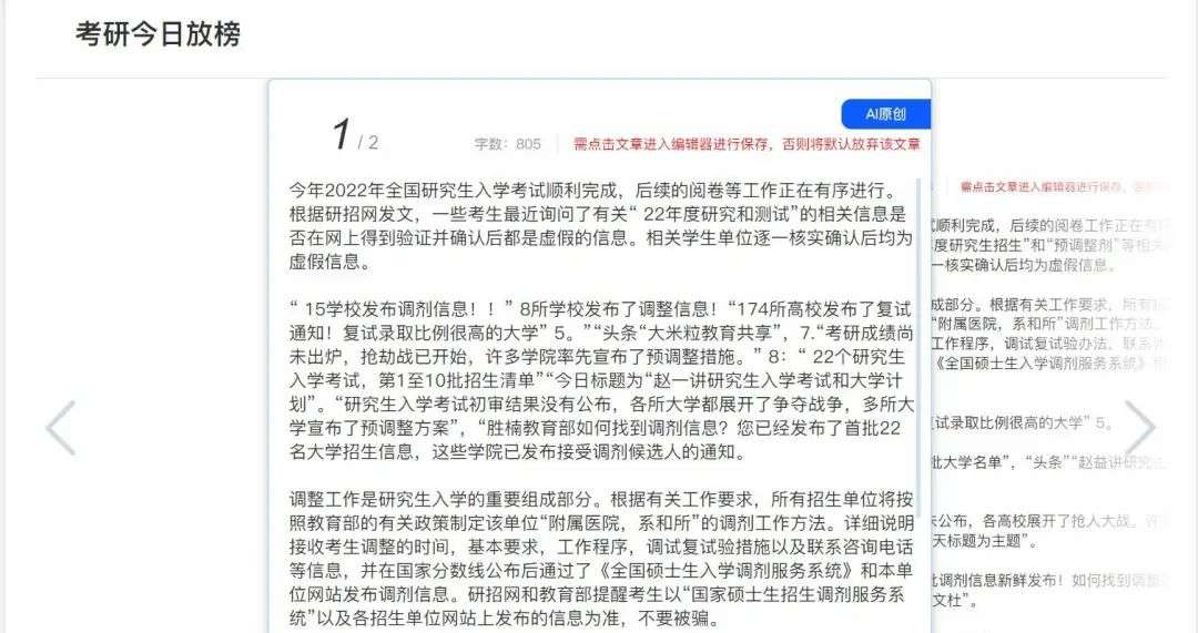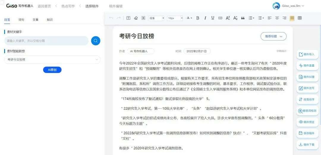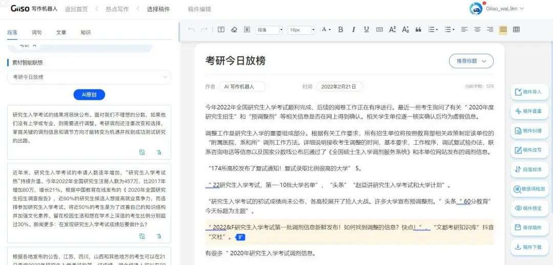 首先来到「热点写作」版面,根据当日的热搜选择了「考研放榜」这个话题,点击「智能写作」,若干篇由 AI 书写的文章就自动生成了,左右滑动挑选最满意的文章进入后即可自由编辑。