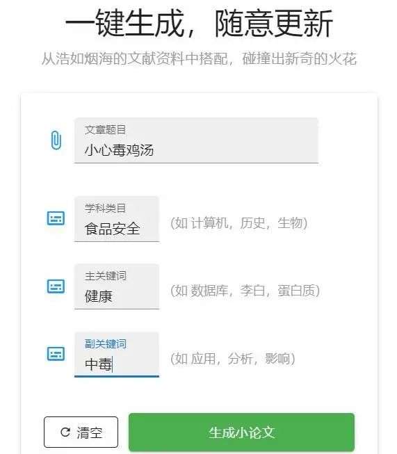输入题目(不重要)、学科和两个关键词后《小论文生成器》帮助论文苦手轻松写出 3000 字长文,一秒交作业再不是梦。
