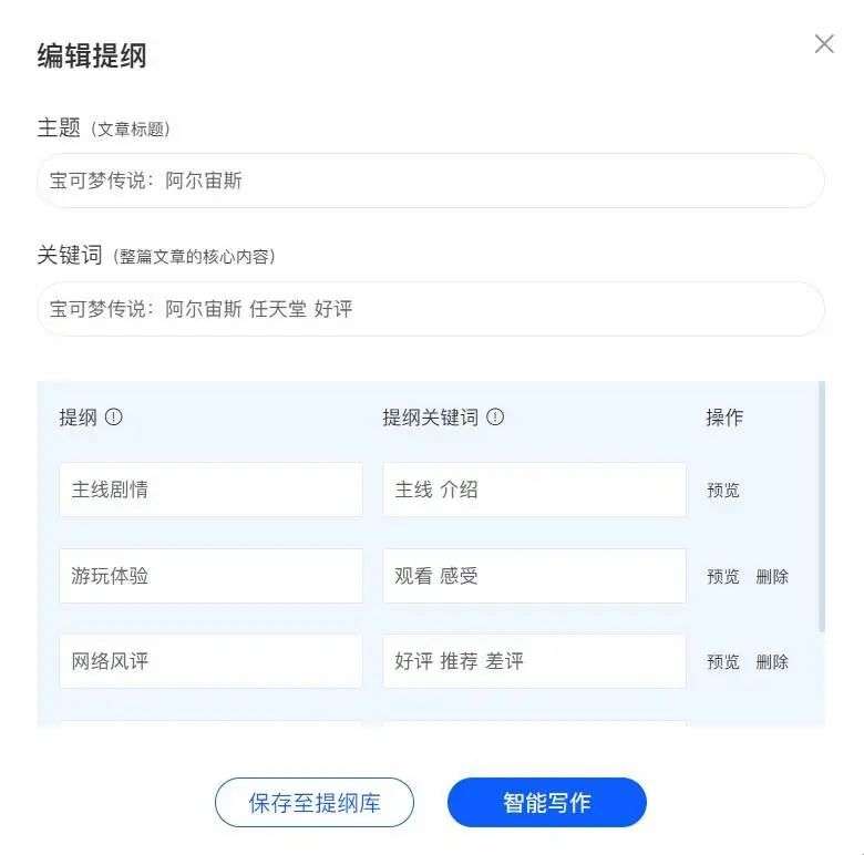 「提纲写作」允许用户创建自己的私人提纲,「主题」和「关键词」是文章大致的覆盖范围(决定程序该从哪些方面为你找资料),下方蓝色框框内的「提纲」为文章内的小标题,「提纲关键词」是该小标题下的主要内容。