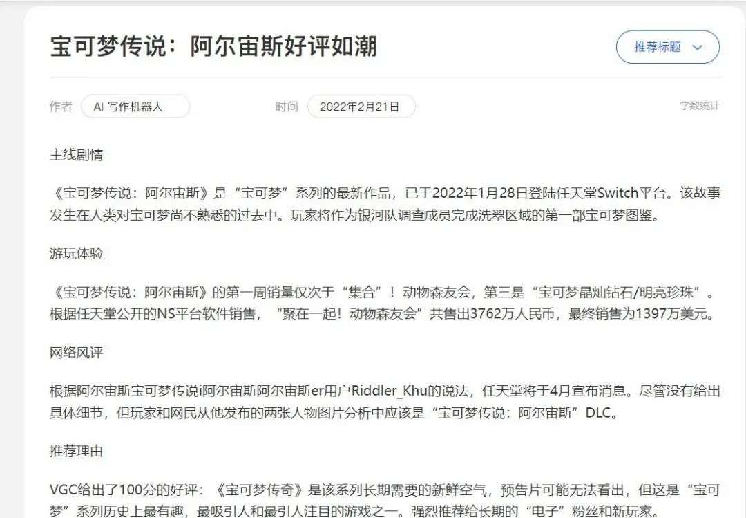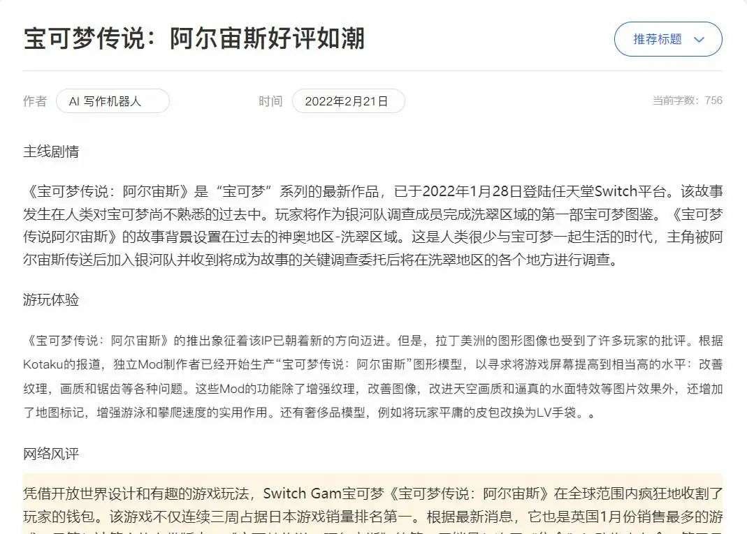 要求纯良的 AI 去论证一个错误的话题(喝鸡汤长生不老)也许太苛刻了,但写一篇《宝可梦传说:阿尔宙斯》的介绍性文章应该就不难了吧?